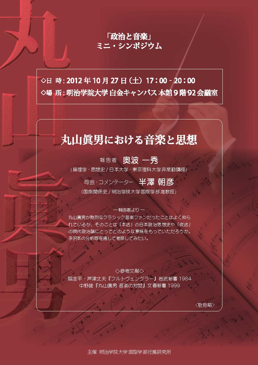 参加希望の方は10月25日(木)までに下記アドレスまでメールにて、件名に「政治音楽ミニシンポ申し込み」 とご記入の上、お名前、ご所属、連絡先をお送りください。申し込み先:(終了しています) |
