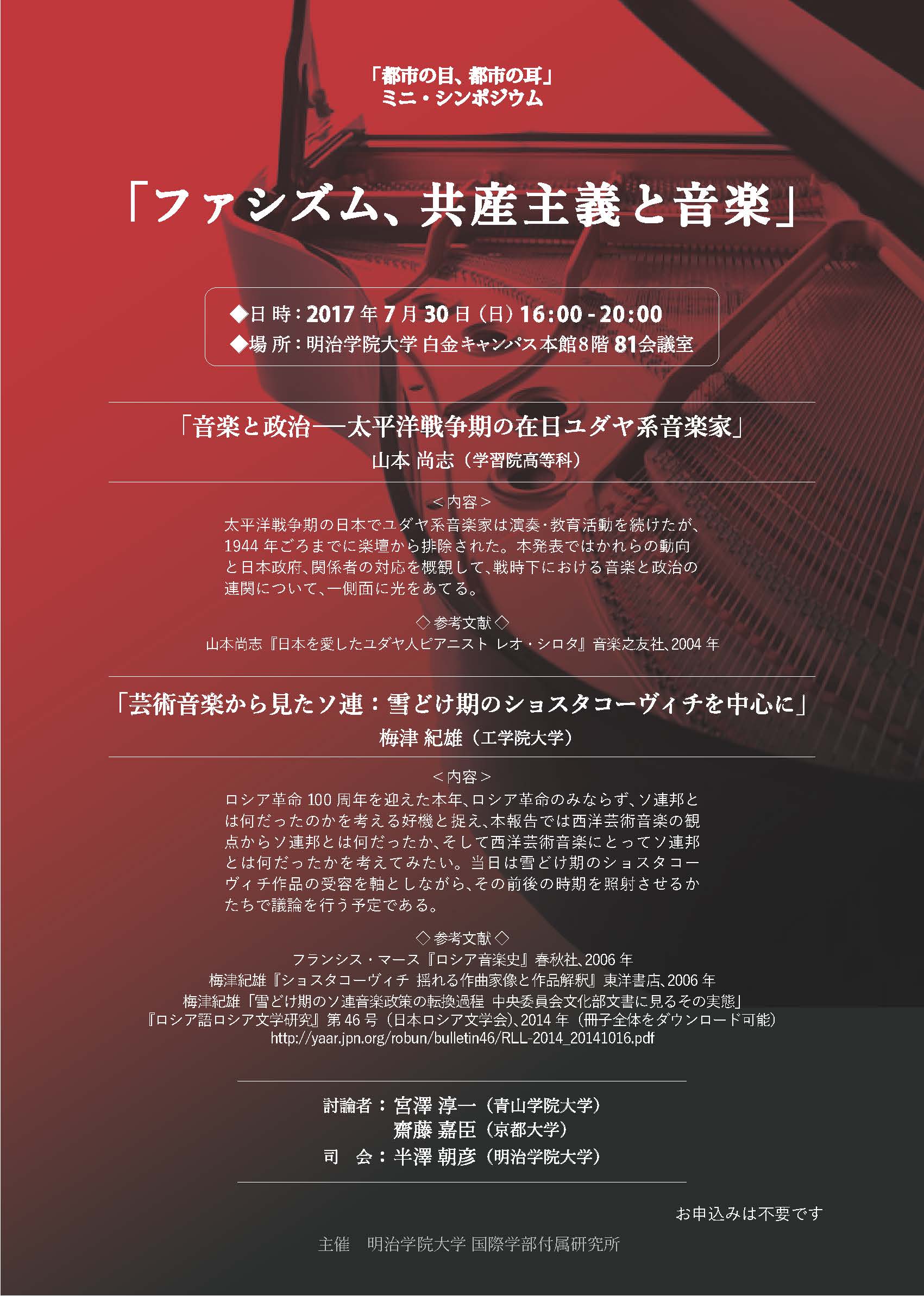 山本 尚志(学習院高等科) 「音楽と政治―太平洋戦争期の在日ユダヤ系音楽家」 太平洋戦争期の日本でユダヤ系音楽家は演奏・教育活動を続けたが、1944年ごろまでに楽壇から排除された。本発表ではかれらの動向と日本政府、関係者の対応を概観して、戦時下における音楽と政治の連関について、一側面に光をあてる。 |