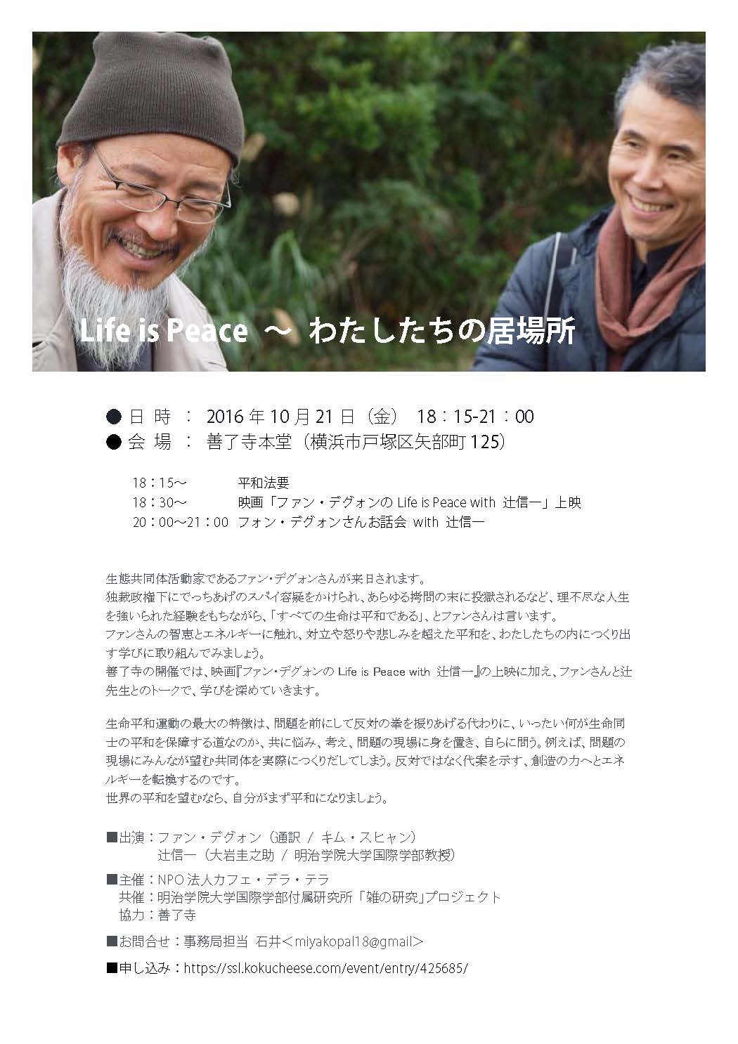 18:15~ 平和法要 18:30~ 映画「ファン・デグォンのLife is Peace with 辻信一」上映 20:00~ フォン・デグォンさんお話会 with 辻信一 出演者 ファン・デグォン(通訳 / キム・スヒャン) フォン・デグォンのLife is Peace |