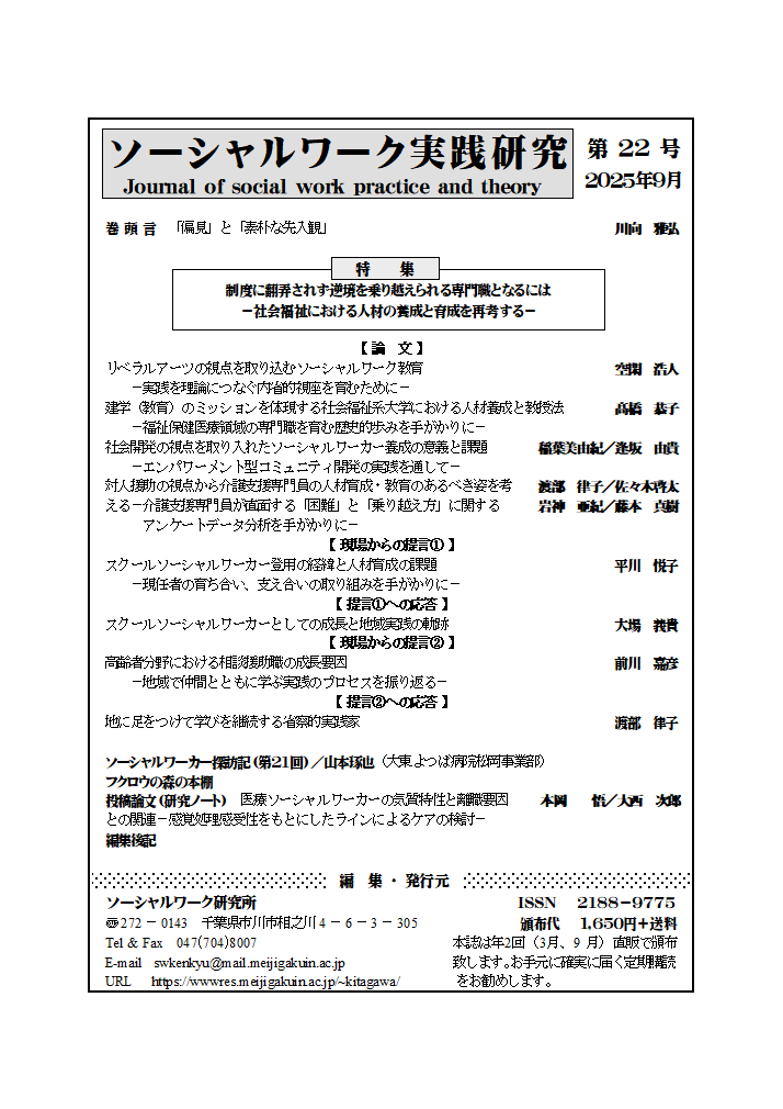 ジャーナル(実践と理論の総合誌)『ソーシャルワーク実践研究』第22号(2025年9月刊行)は2025年10月6日から頒布を開始しました。特集テーマは「制度に翻弄されず逆境を乗り越えられる専門職となるには−社会福祉における人材の養成と育成を再考する−」です。