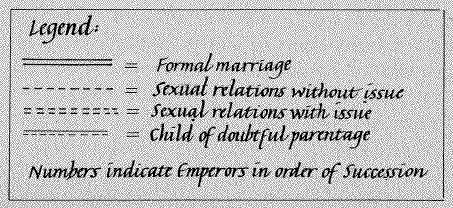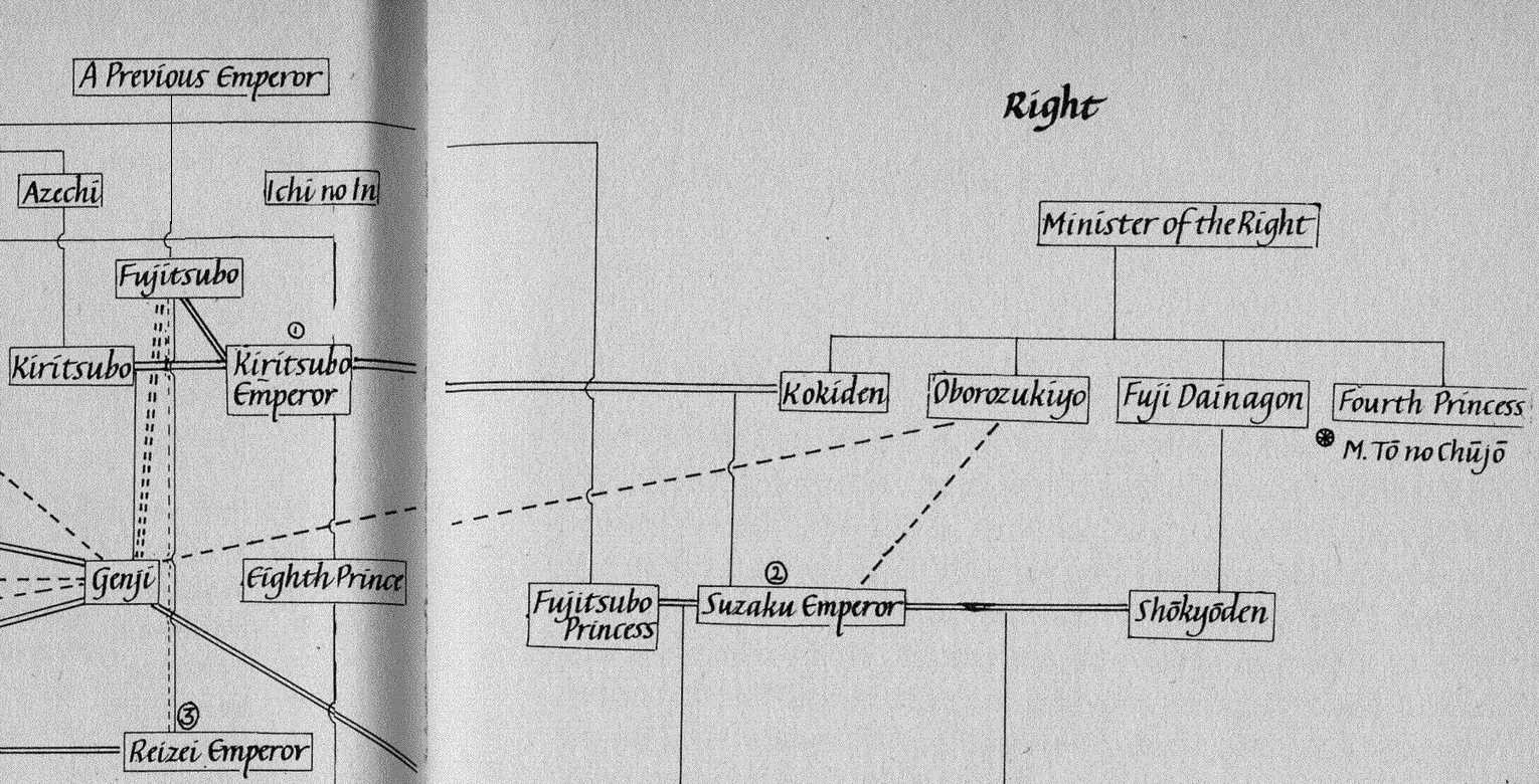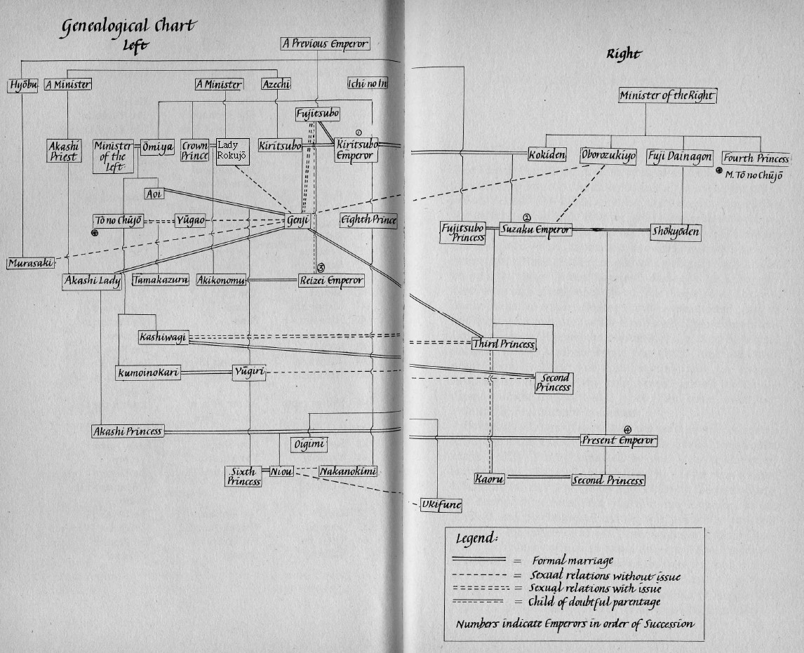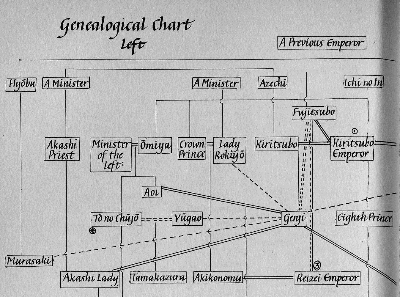 Genealogical chart of characters in the Tale of Genji. Reproduced from Richard Bowring, Murasaki Shikibu: The Tale of Genji* (Cambridge, 1988) with the kind permission of the author. *Now back into print again in new edition (2004).
