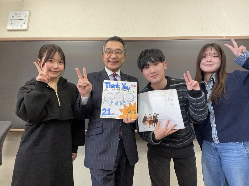 今回のゼミ生は私の退職年ということで人数もすくなかったですが、少人数ゼミの特徴をいかし、ゼミ生といろいろな議論ができました。最後に感謝の色紙と好物のカステラをいただき、感動でした。